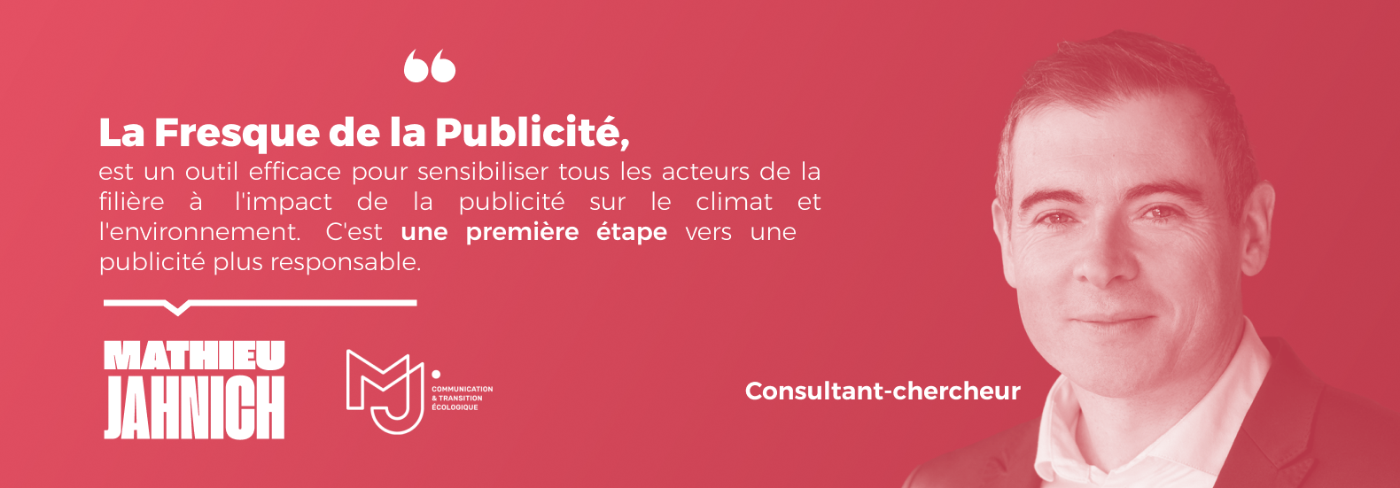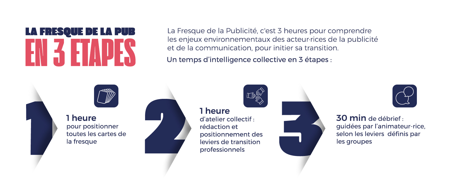 Inspirée de la Fresque du Climat, qui a pour vocation d'éveiller le grand public aux conséquences du changement climatique, la Fresque de la Publicité permet de réfléchir à l'empreinte environnementale directe et indirecte de l’industrie publicitaire et de travailler collectivement sur des solutions concrètes pour une publicité plus durable et responsable.